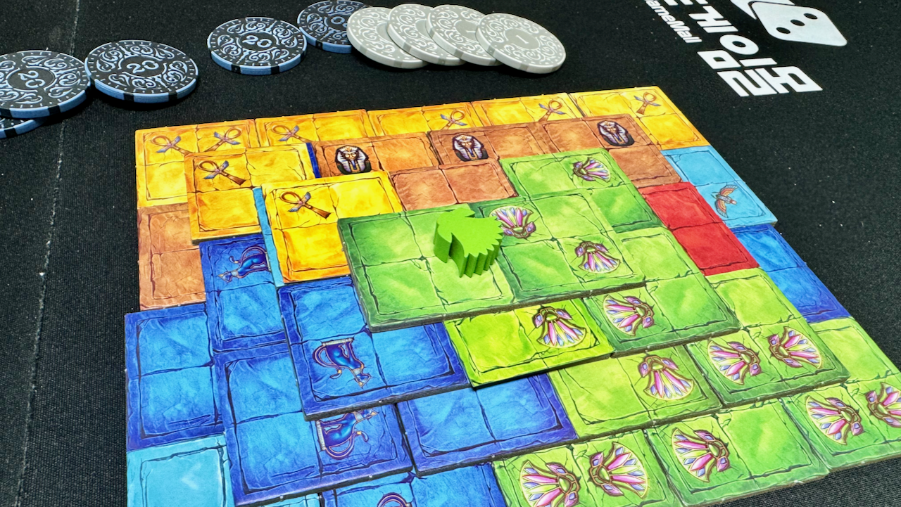 도미노 형태의 타일을 모아서 피라미드를 쌓아가는 게임입니다. 한 층을 완성할 때마다 점수 계산을 하는데, 토큰이 놓여 있는 구역에 있는 아이콘 숫자만큼 점수를 받게 됩니다. 그리고 이번 층에서 받은 점수 중 가장 적은 점수를 받은 토큰으로는 점수를 한 번 더 받고요.