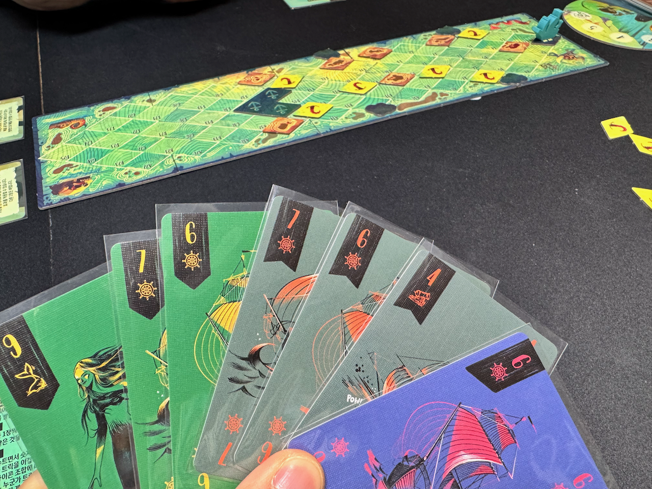 각 트릭마다 두 플레이어가 사용한 카드에 적힌 심볼의 조합이 무엇이냐에 따라서 다른 일이 일어납니다. 배가 안전히 항해하기도 하지만, 어쩌면 그 과정에서 배가 크라켄에게 파손될 수도 있습니다. 대포를 사용해 크라켄의 공격을 방어할 수도 있고요.