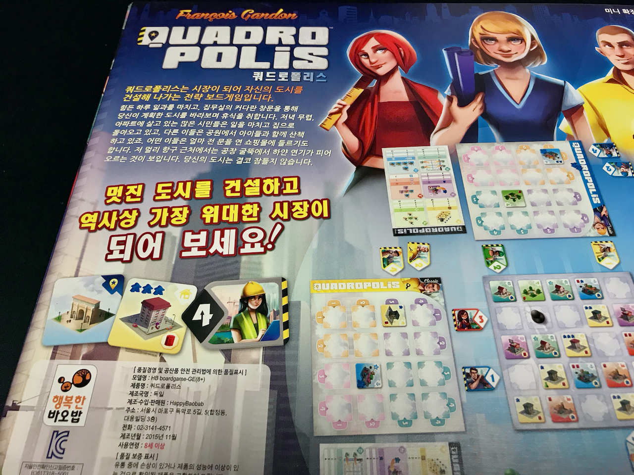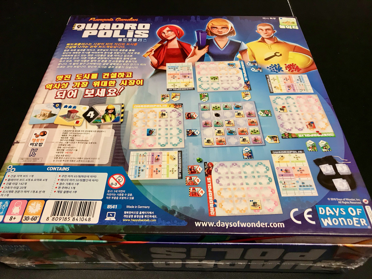 Days of Wonder에서 개발하고 행복한 바오밥에서 한국어판을 발매한 「쿼드로폴리스 (Quadropolis)」 한국어판의 개봉샷입니다.