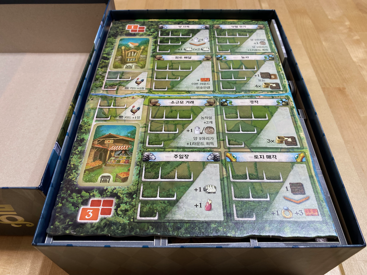 모든 게임에서 사용하는 카드인 보너스 카드, 점수 카드는 눕혀서 보관해야 하고, 울타리 카드 및 안마당 카드 한 종류도 보관할 수 있습니다. (...보관해야 합니다?)
